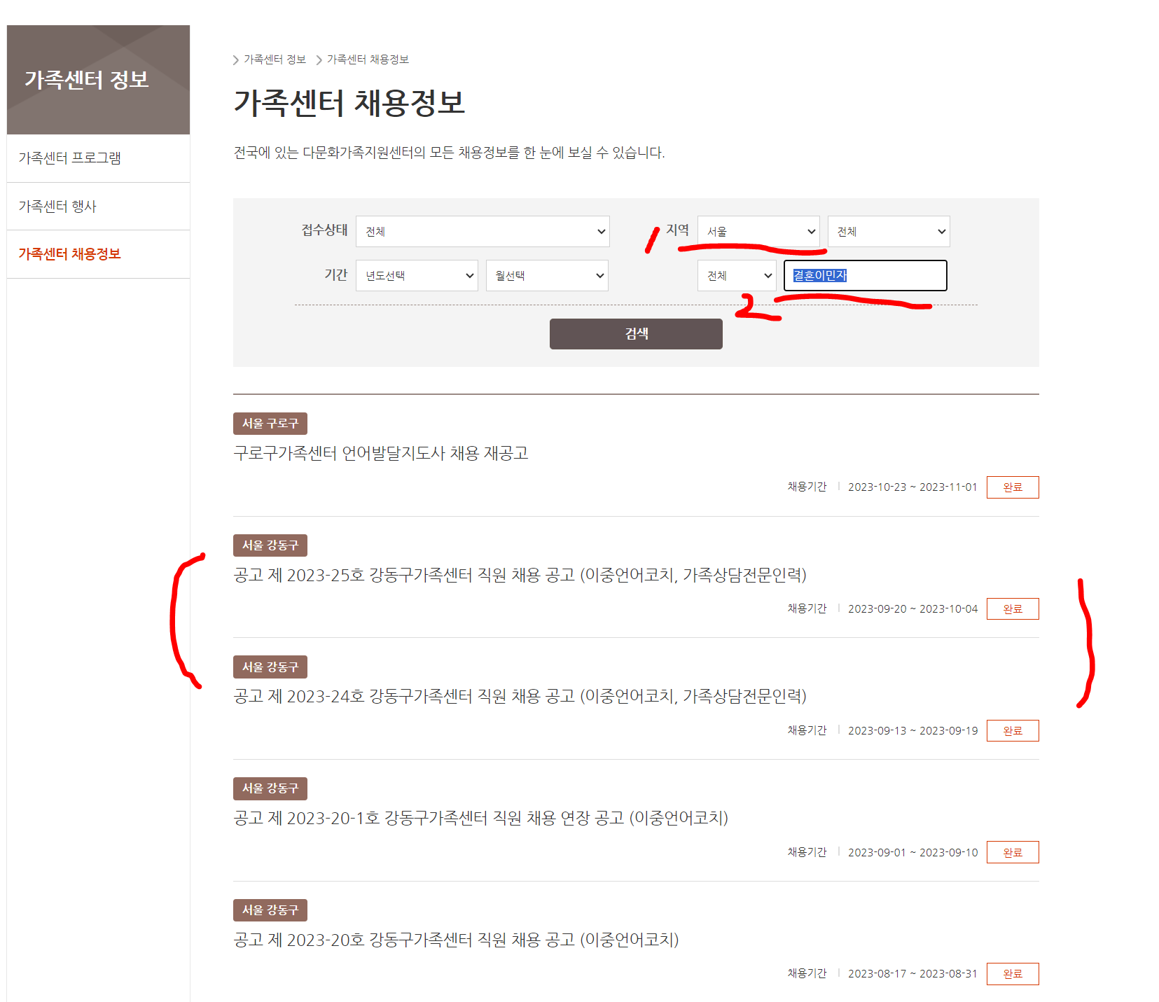 1️⃣ 홈페이지에서 "가족센터정보" → "가족채용정보" 클릭