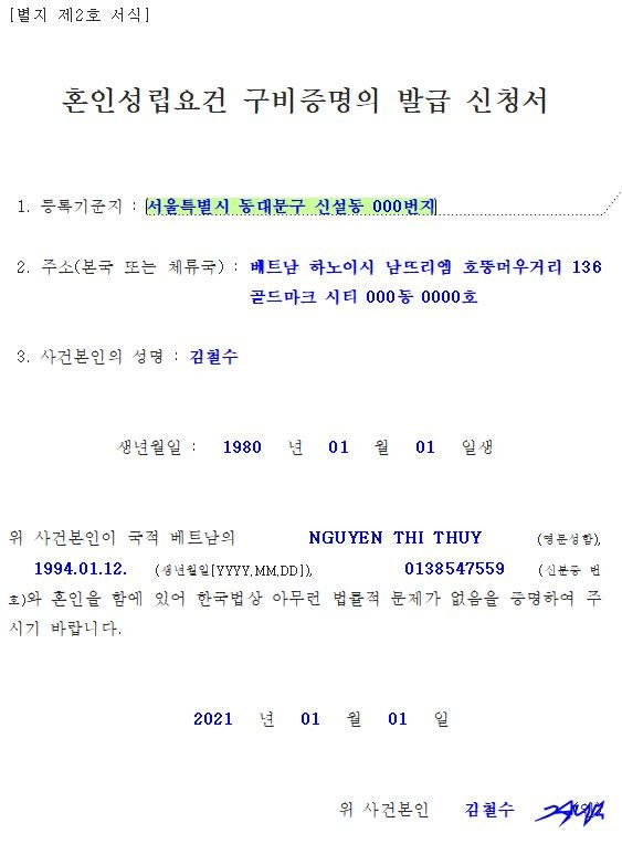 | 샘플-2 | 혼인성립요건 구비증명서 발급 신청서 | 혼인관계증명서 발급 후 신청서 작성 |